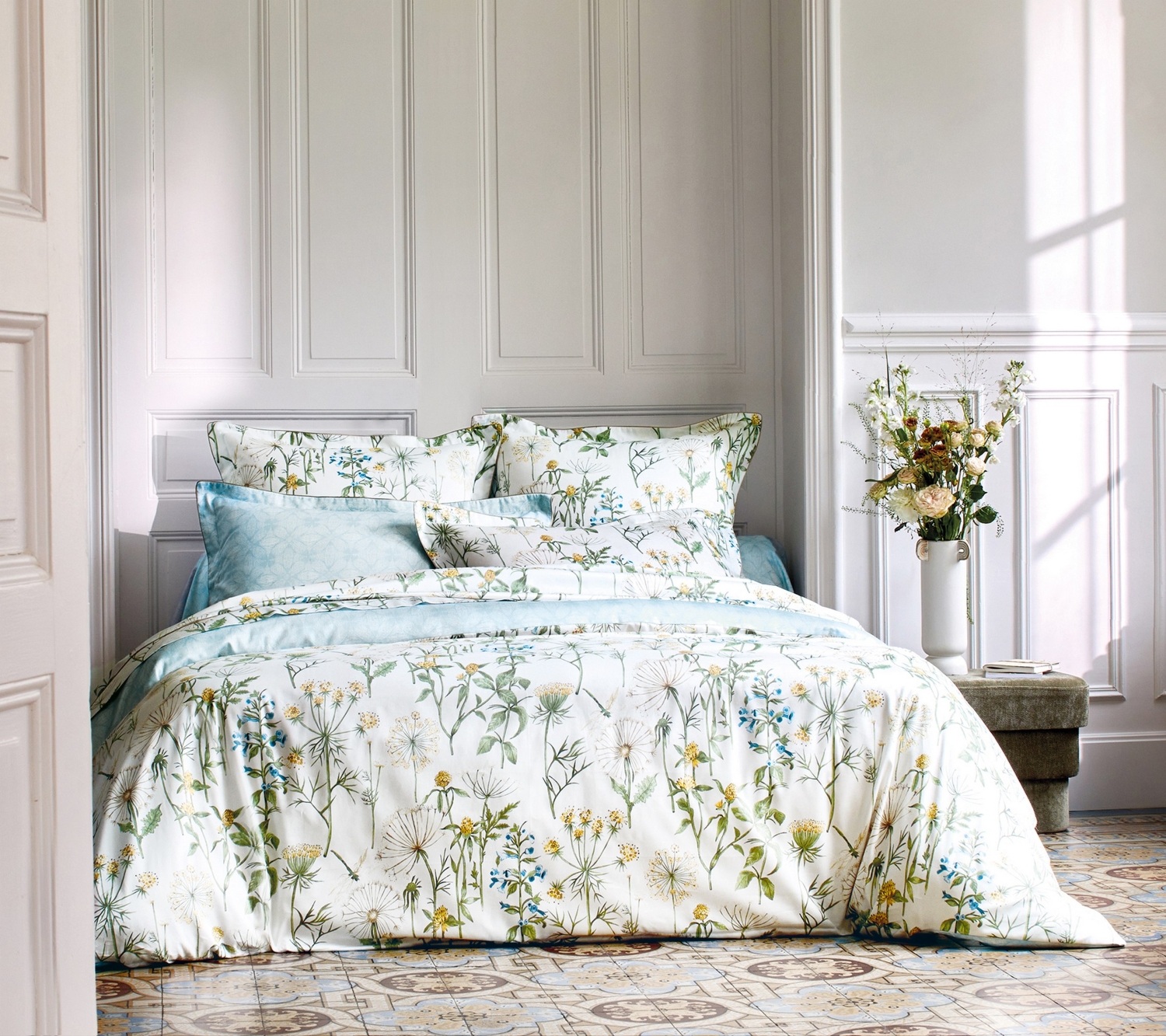The Angelica Lime bedding set, made of prima cotton sateen, unfolds in soft blue and lime-green florals, bringing a gentle garden calm to the bedroom.